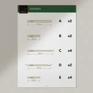 Indkøbsliste for træ og skruer er inkluderet i byggevejledningen sammen med nøjagtige saveinstruktioner og trin-for-trin monteringsguide.