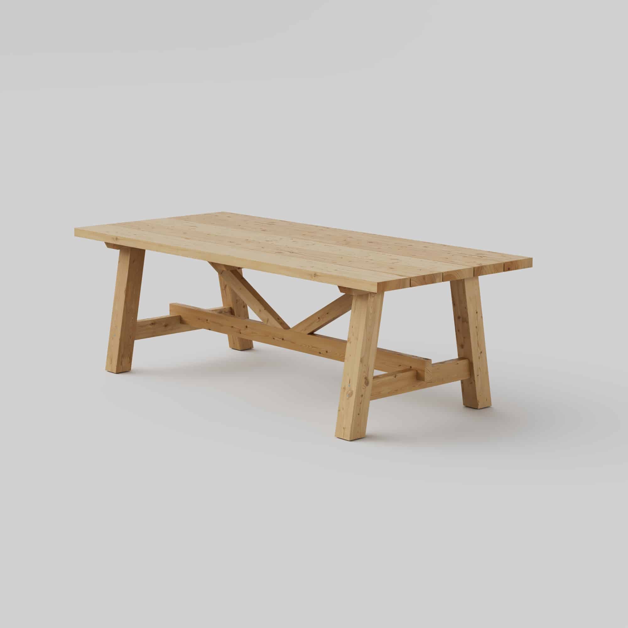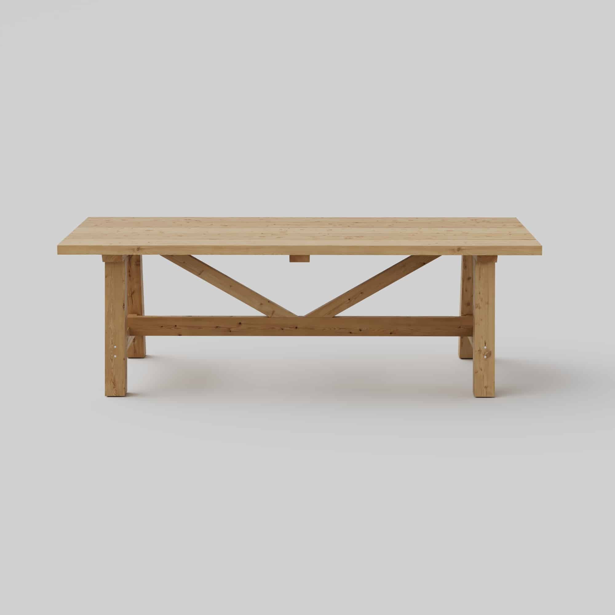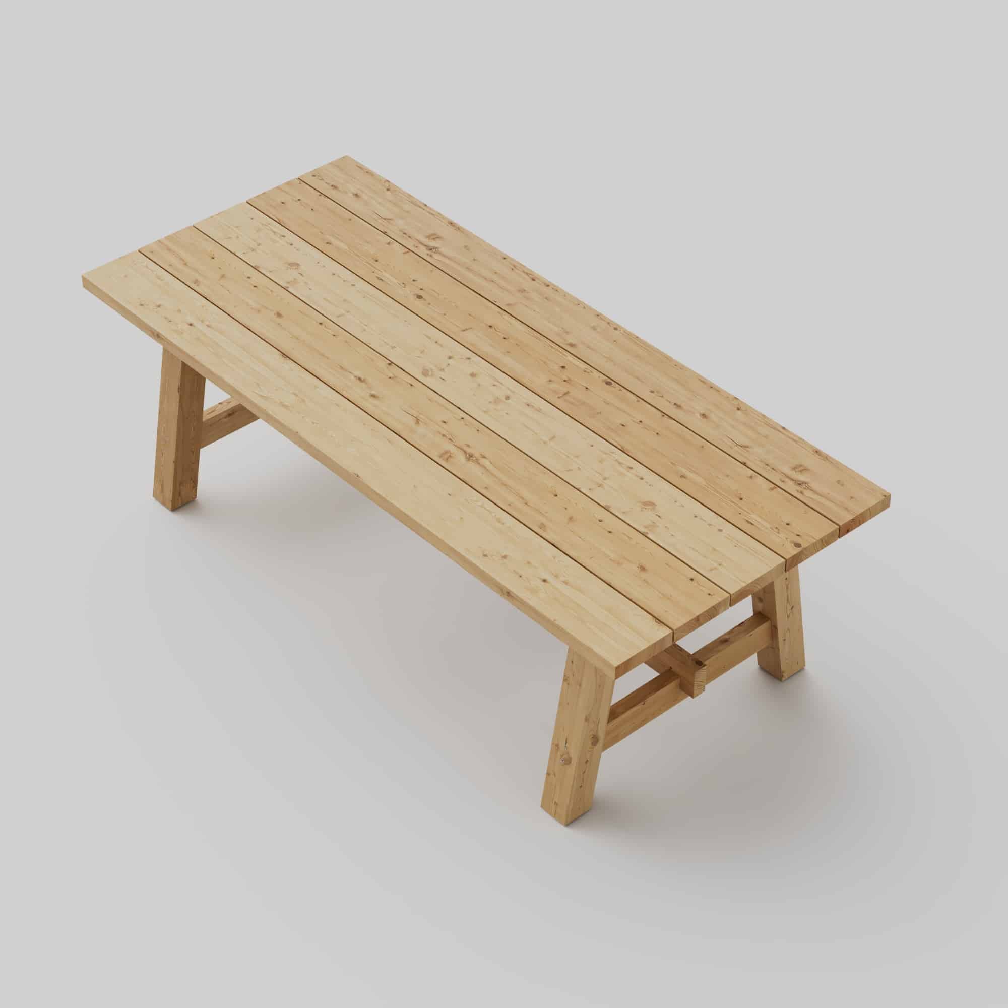Bauanleitung für einen Dielentisch im Landhausstil, der einen rustikalen und natürlichen Charme ausstrahlt. Dieser Tisch ist mit stabilen Beinen ausgestattet, die leicht angewinkelt sind, um zusätzliche Stabilität zu gewährleisten, sowie mit schmaleren Zwischenbalken, die zur stabilen Konstruktion des Tisches beitragen.