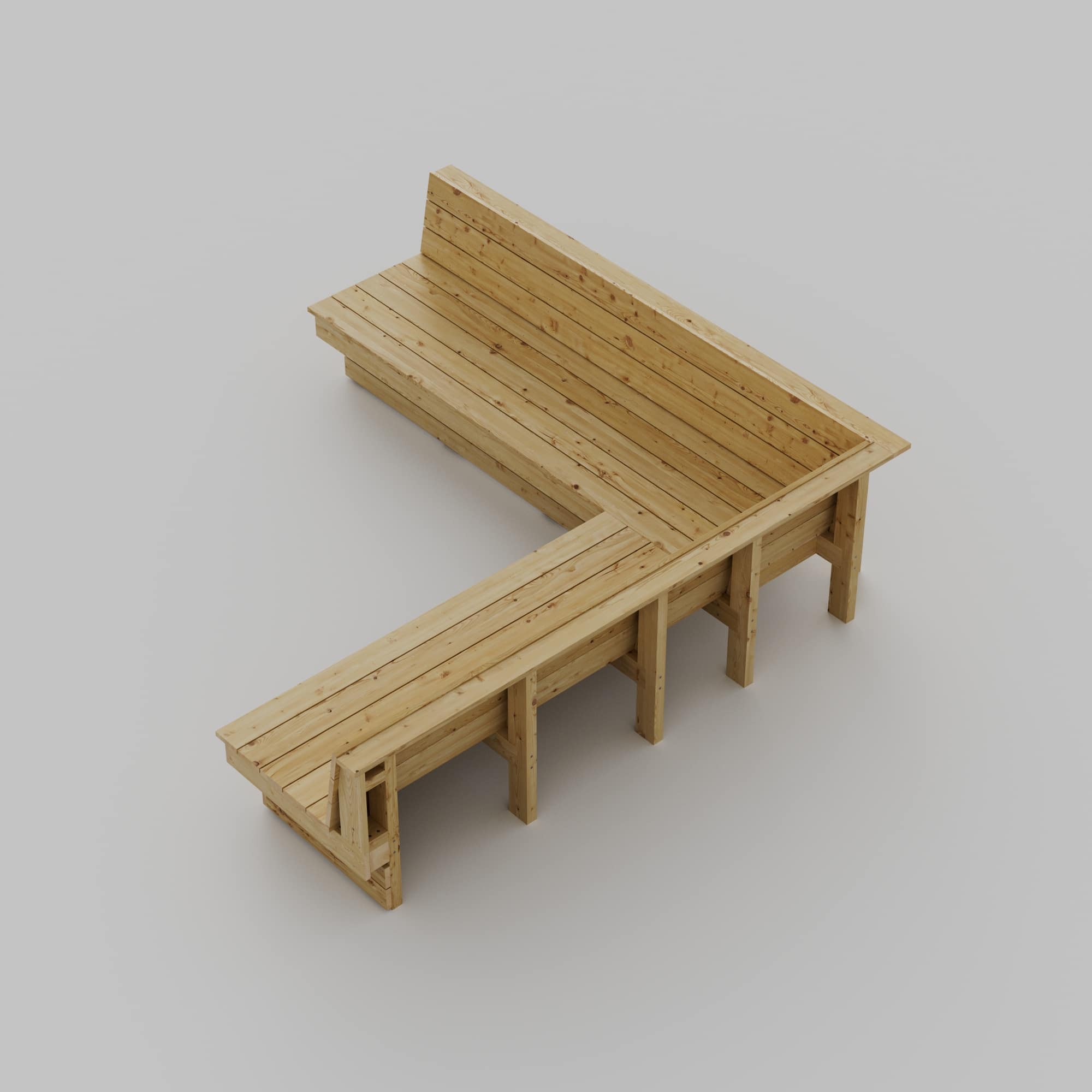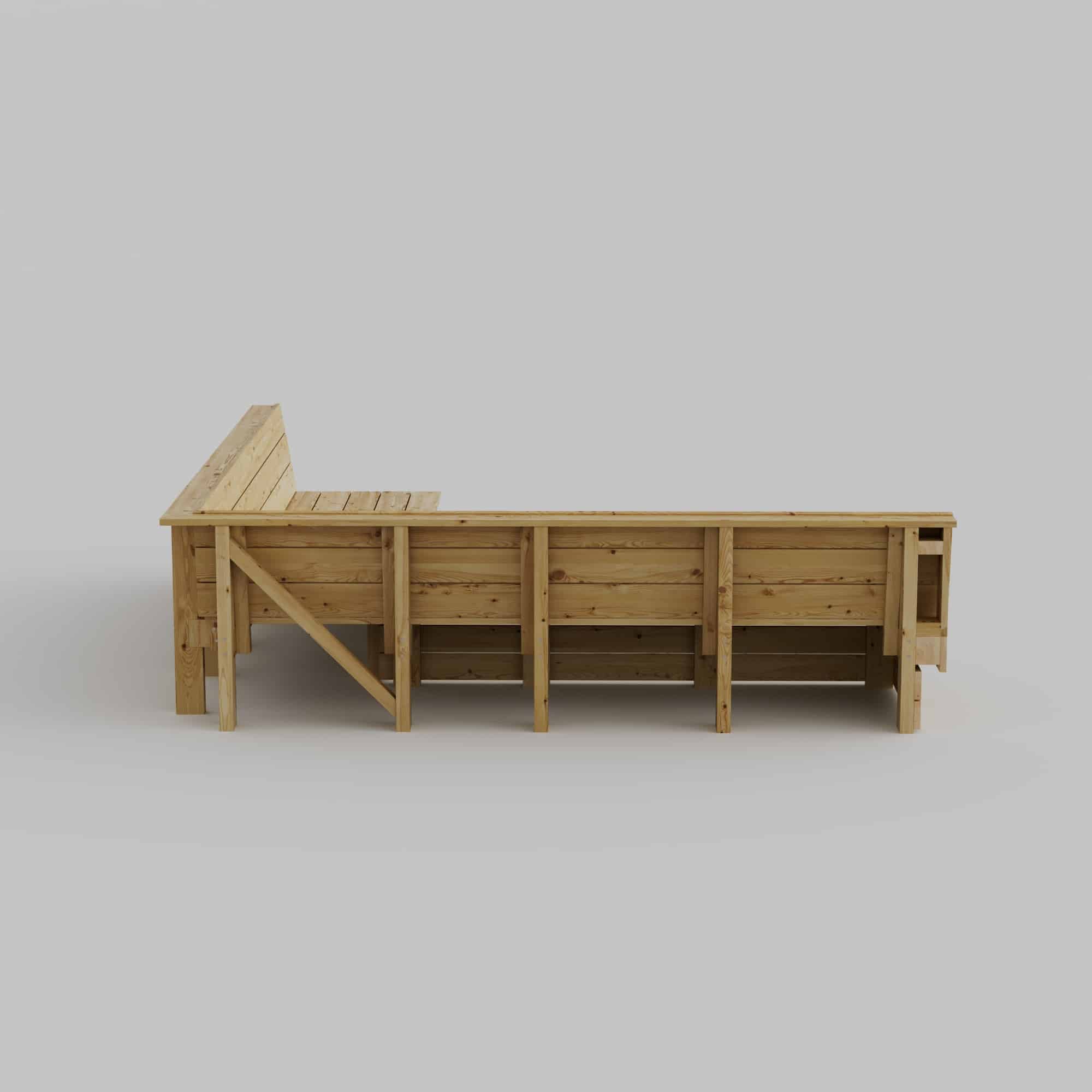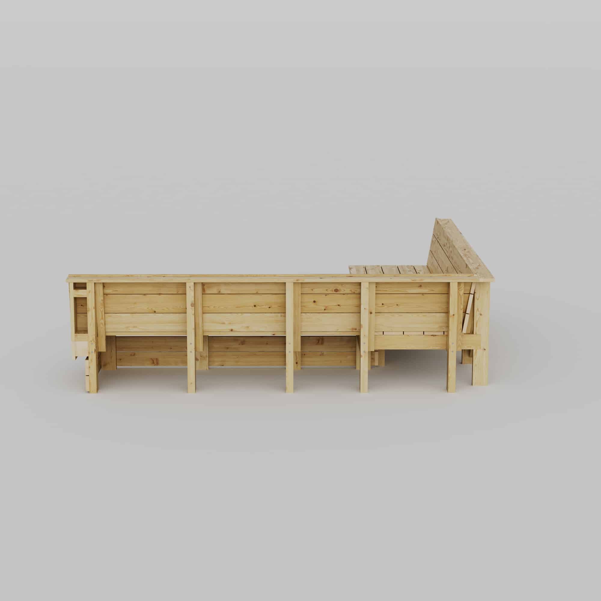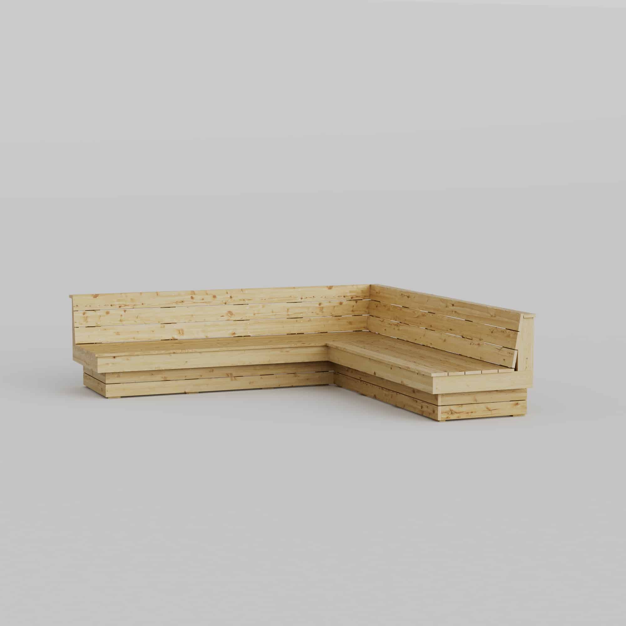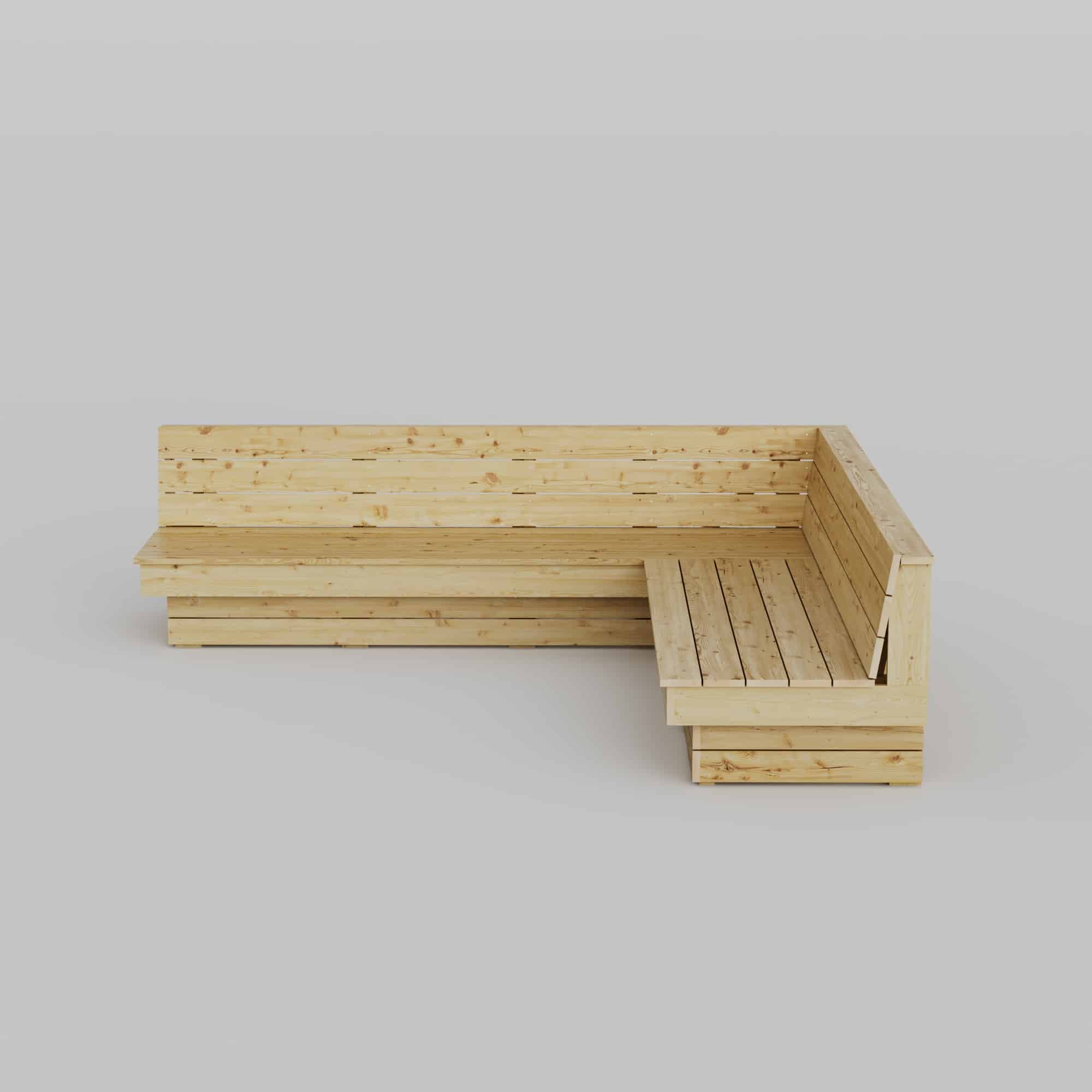 Byggebeskrivelse for å bygge en platsbygget hjørnesofa. Den er utformet for å passe perfekt i et hjørne på uteplassen og skaper et naturlig og innbydende samlingsrom med generøs sitteplass for seks til åtte personer. Med sitt L-formede arrangement utnytter den plassen effektivt og passer utmerket plassert mot et gjerde, en husvegg eller i et hjørne av en terrasse eller et tredekk.