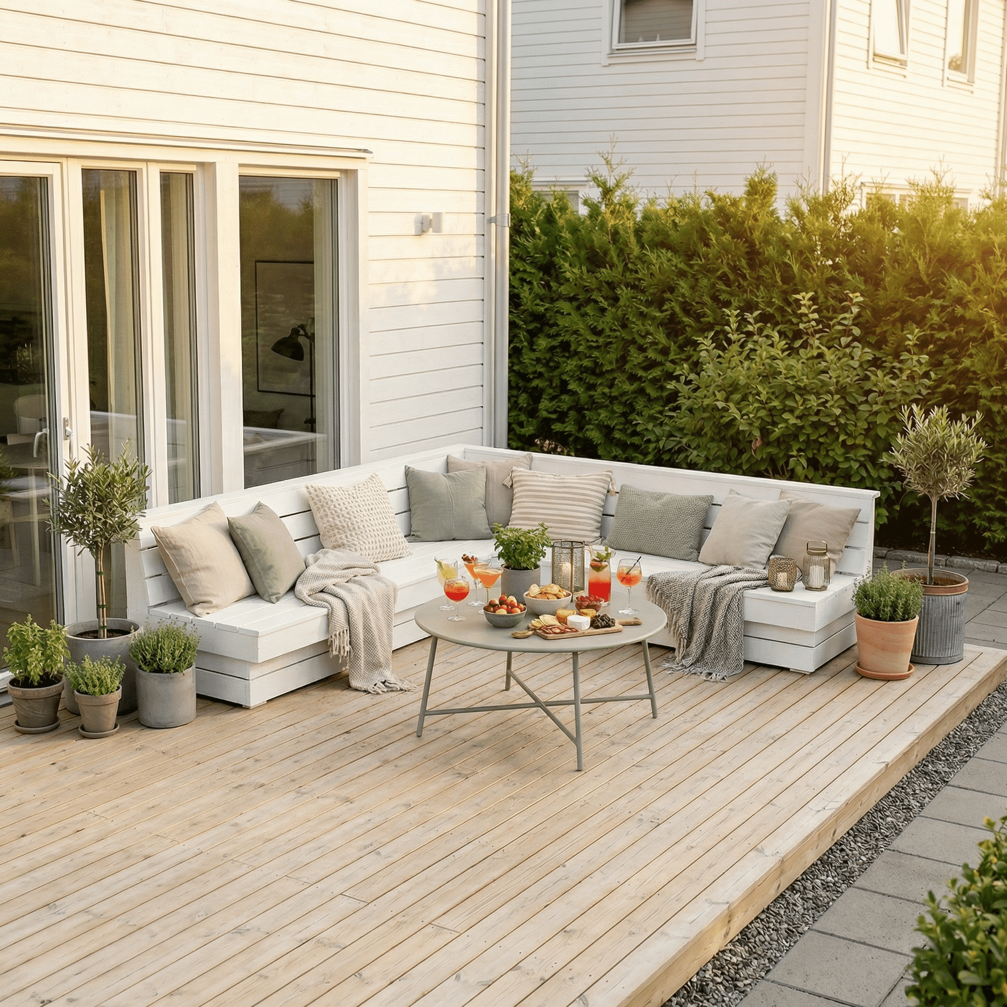Bygg en platsbyggd hörnsoffa som passer perfekt i uteplassens hjørne og skaper en innbydende samlingsplass med generøs sitteflate for 6–8 personer. Den tidløse, avskårne designen utnytter plassen smart, tørker raskt etter regn og er lett å matche med dine utemøbler. Du får komplett byggebeskrivelse med innkjøpsliste, kapp- og saging, tegninger og steg-for-steg montering – last ned direkte og kom i gang.